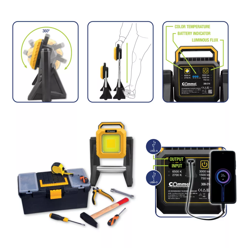 Commel Állványos Led Reflektor, 30W, 3000lm, 4000-6500K, IP44, Állítható mgasság:240-1020mm